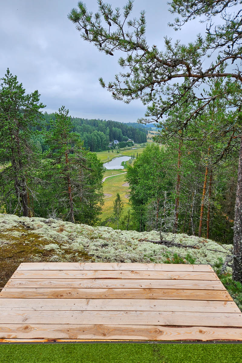 Väylälle päästäkseen noustaan korkeita portaita pitkin jyrkän kallion huipulle. 170 porrasta vie 40 metrin korkeuteen, josta maisemat avautuvat entistä upeampina. Tunne on huikea, kun sieltä, jäkäläiseltä, harmaakallioiselta jyrkänteen reunalta, pääsee heittämään frisbeen alas väylälle. Kori siintää kaukana alapuolella.