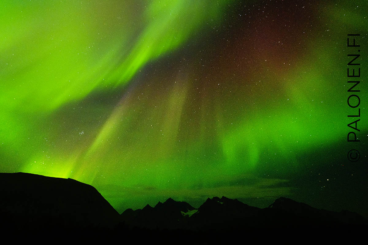 Talvella Lyngen (ja koko Tromssan seutu) on erinomainen paikka bongata revontulia. Onnekas voi nähdä niitä jo syyskuun ruska-aikaan.