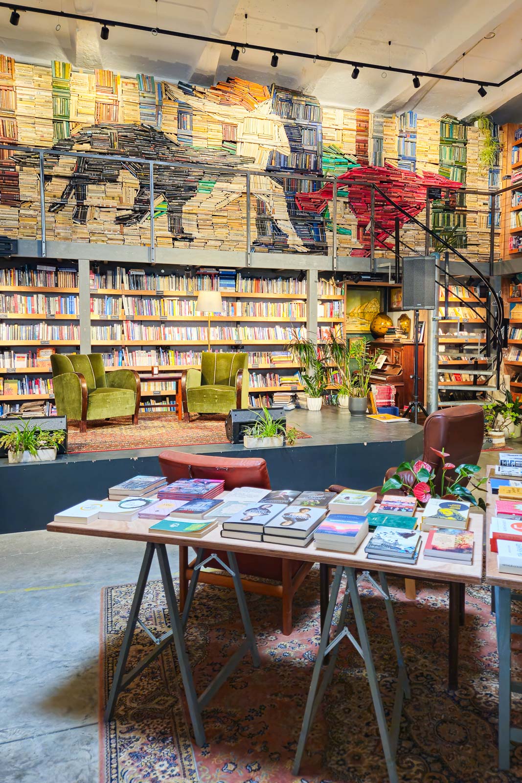 Pohjolan tehtaan kirjakauppa REaD kutsuu viettämään aikaa. Seinällä on 5000 kirjasta koottu mosaiikkiteos, joka kuvaa naista juoksemassa susien kanssa. Kuva: Antti Helin